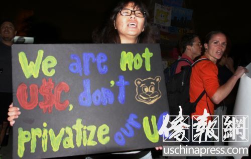抗议人群中的一位学生手拿写有“我们不是南加大,别把加大变私立学校”字样的标语牌示威。(美国《侨报》/邱晨 摄)