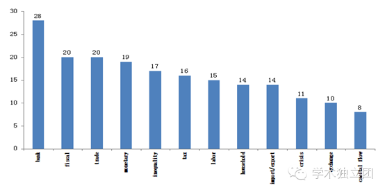 所有working paper来自NBER,IMF和World Bank三大机构,以保证working paper的权威性和质量。选取上半年发布的所有与经济类议题相关的研究成果,共620篇。将文章题目统一整理后,进行词频统计,得到一些高频实词。首先,从中剔除类似Development,Economics和Growth之类的类虚词;然后,将强相关词和词形变体合并,如poverty和poor,export和import等;最后,剔除一篇文章相同关键词出现两次的情况。最终,词频较高的词如下图所示。