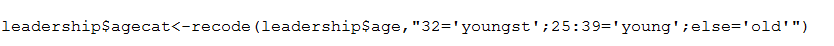 > recode(leadership$age,"32='youngst';25:39='young';else='old'")
