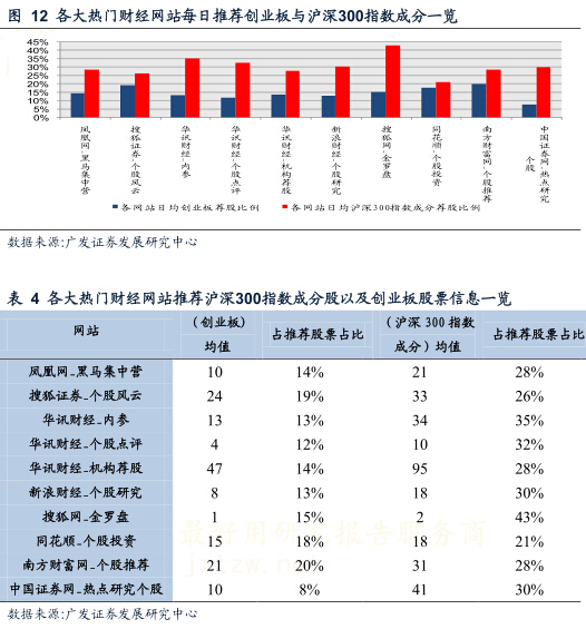 从区分各大网站每日推荐的板块角度上看,就创业板而言,各大财经网站每日平均推荐的创业板股票占总推荐股票比例在15%左右,其中,南方财富网的个股推荐栏目每日平均推荐的创业板股票占其每日平均推荐股票的比例最高,为20%.而中国证券网的热点研究个股栏目每日平均推荐的创业板股票占其每日平均推荐股票的比例最低,为8%;从沪深300指数成分推荐而言,各大热门财经网站每日推荐的沪深300指数成分股数量占其推荐股票数量均大于20%,其中同花顺的个股投资栏目推荐比例最少,为21%,而搜狐网的金罗盘栏目推荐比例最多,为43%。