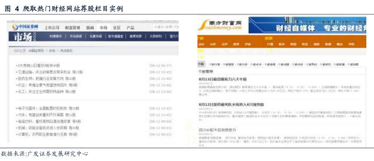 当前,是互联网信息时代。互联网在过去10年里,经历了快速发展阶段,信息的爆炸性增长也使得人们获取的信息量迅速地增加。人们获取信息的途径也越来越丰富。而在互联网大数据时代下,信息的提供者与使用者之间的界限已经越来越模糊,金融信息的来源渠道也越来越丰富多样。投资者有更多的渠道来获取相关的金融信息,过去上百年的金融研究,往往局限于对以数字形式存在的数据的研究,而忽略了对非结构化的金融“数据”的研究,在当前互联网时代下,分析师的研究报告、股吧论坛帖子的信息、新闻媒体的新闻以及微博和维信等非结构化文本信息往往能够反应当前市场上投资者对股市的投资情绪,而这些信息往往又对投资者的投资决策起到潜移默化的作用。据相关报道,2011年8月24日,巨人网络董事长兼首席执行官史玉柱通过微博透露中国人寿“虎视眈眈”欲控股民生银行,随后民生银行股价在两个交易日大涨,史玉柱旗下公司所持该行股份浮盈2.56亿元, 他的这条微博也因此被称为“史上最贵微博”; 2012年12月6日,“SOHO中国”在某热门财经网站上发布中标消息称:“在刚刚结束的光华路SOHO2项目地上钢结构定标会上,浙江杭萧钢构股份有限公司成功中标!”,随后,SOHO中国董事长潘石屹转发并评论。下午开盘后,杭萧钢构股价应声而上,最高上涨逾6%。可见,媒体的传播已经对个股的涨跌产生了重要的影响。之前我们分别通过股吧帖子论坛、上市公司公告内容、个股新闻热度等三个角度对互联网的文本信息对股市的影响进行了统计分析以及实证,得到了较好的就结果。本专题报告从另一个角度考虑互联网财经相关的文本信息对股市的影响进行研究,我们考虑热门财经网站上推荐股票栏目上的荐股信息对股市的影响,利用大量的热门财经网站上海量的荐股文本信息,从中寻找对个股、行业存在显著影响的信息,并基于此构建量化策略。