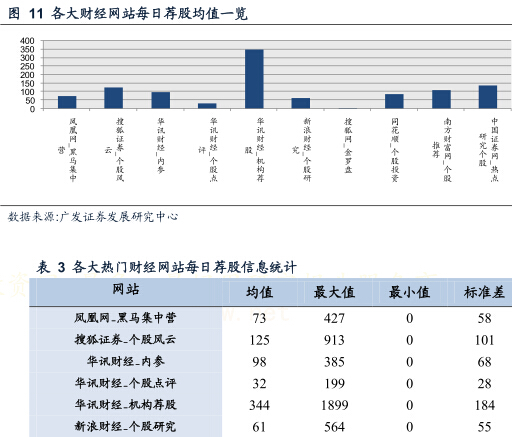 我们首先从简单的统计指标上,看一下各大热门财经网站上每日荐股数量的相关信息。从全样本不区分行业上看,从图10中可以看到,各大热门财经网站上荐股栏目每日推荐的个股数量均匀,其中搜狐网的每日荐股数目最少,平均下来只有每日5只个股,而华讯财经的机构荐股栏目,平均意义上讲,荐股数量最多344只。从标准差角度看,华讯财经的机构荐股栏目每日荐股的数量的波动也是最大的,而搜狐网的金罗盘荐股栏目中每日荐股的数量的波动是最小的。各大热门财经网站荐股数量存在较大差异,也有可能是因为各大热门财经网站样本的时间长度不一造成的。