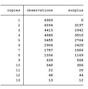 我用了变量查重命令 duplicates report idind,然后就显示图片上那样的结果,为什么observations=surplus*(n+1/n),n=1,2,....,12。