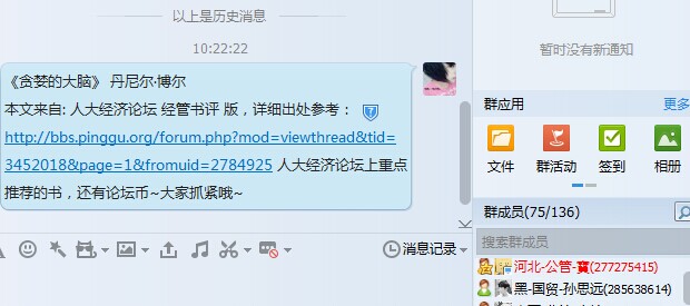 在描述“激烈的神经元战争”时,他写道:“注意在选择意识的内容,相互竞争的神经元同盟都希望自己的声音是最响亮的,从而被选中。那些具有强有力的声音的神经元能动员其他神经元支持自己的想法,同时抑制持不同意见的神经元的活动,知道几百万个神经元一起用同一种声音表达一种强烈的想法……每次产生一个新想法,这个想法都要经过拥挤的、充满尖叫声的神经元部落之间的激烈战斗,才能成为思想中占统治地位的一个派系。”(p106)感觉怎么那么像描写每一次大会之前的各派思想大碰撞呢?难道人类社会的组织体跟人类的大脑是一样的结构和运行模式?让人想起柏拉图在《理想国》提出通过大写的人(城邦)来理解小写的人(灵魂),源自古希腊的灵魂学今日的继承人貌似就是心理学心灵哲学……