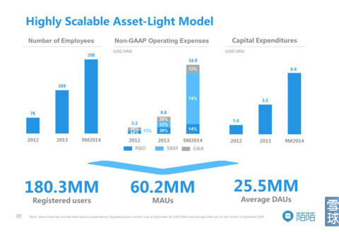 用户数方面,截止今年9月,MAU 6020万,是2013年3月的4.6倍,9月平均DAU 2550万,是2013年3月的5.4倍,群组数量450万,是去年3月的15倍。