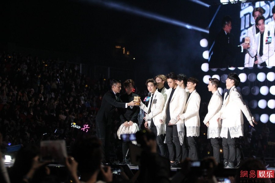 颁奖前示意台下粉丝安静,以尊重接下来得奖的艺人。不过,当刘德华以双手躬身送出奖座时,EXO的队长Suho单手接奖兼未对对方正面看一眼。有粉