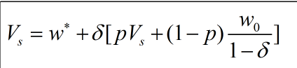 书上P203页,工人如果选择偷懒,则高产量概率为p,低产量概率是1-p,高产量时的工资w※,低产量时的w0,即解雇,记Vs为工人偷懒时无线重复博弈得益的现值,那么有如图的结果,其中δ是贴现因子