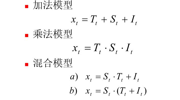 X-11法是美国商务部标准的调整方法(乘法模型、加法模型),乘法模型适用于序列可被分解为趋势项与季节项的乘积,加法模型适用于序列可被分解为趋势项与季节项的和。乘法模型只适用于序列值都为正的情形。
