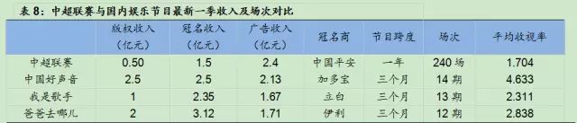 中超联赛这一赛事在与国内娱乐节目的对比中落于下风。与热门娱乐节目相比,中超联赛具有周期长、收益低的特点。相比于廉价的中超联赛转播节目,如今做的比较火的几档电视综艺节目出售给视频网站的版权费则轻松过亿,如《中国好声音》第二季的网络独播权以1亿元卖给了搜狐视频,而第三季的独播权更是以2.5亿左右的高价被腾讯视频拿下,平均下来单集的价格高达1500万元左右,几乎是场均转播费用仅仅为20万元的中超联赛的75倍。《我是歌手》第二季的网络独播版权落户乐视网,据称版权采购金额过亿元,平均单集转播价格超过500万元。而红遍全国的《爸爸去哪儿》则是与湖南卫视另外四档节目《快乐大本营》、《天天向上》、《百变大咖秀》、《我们约会吧》打包卖给了爱奇艺视频,总价为2亿元。对比之下,作为中国大陆地区最优秀的职业足球俱乐部参加的全国最高水平的足球职业联赛,中超凝聚了足球运动员艰苦训练和教练战术智慧结晶,每年吸引数亿球迷守在电视机前观看比赛,整个赛季却仅仅只有5000万的转播版权收入,这与它的重要性和关注度实在大不相配,未来仍具有非常大的开发空间。