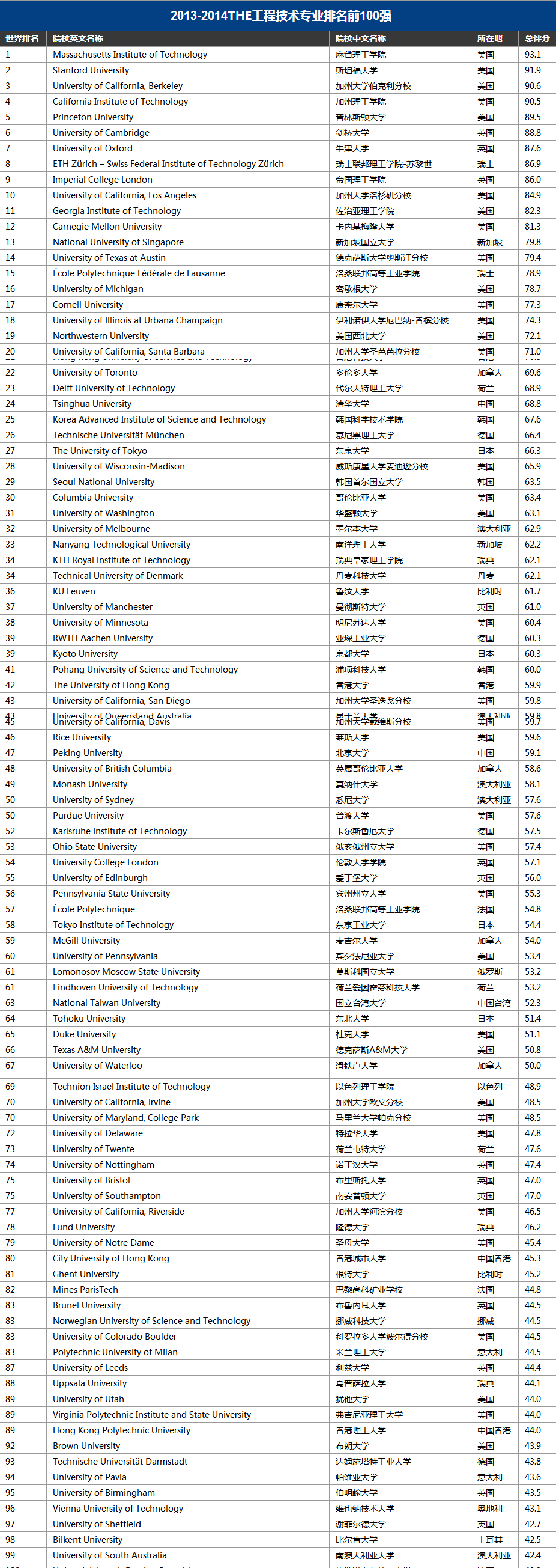 2013-2014工程技术专业排名前100强刚刚新鲜出炉,看看排名真的让人好生兴奋啊,世界一流大学果然名不虚传,个个都是顶呱呱的,好厉害。这是由英国泰晤士报报道的2013-2014工程技术专业排名前100强,所以非常具有可靠性和信任度。下面就来看看2013-2014工程技术专业排名前100强的名单吧。