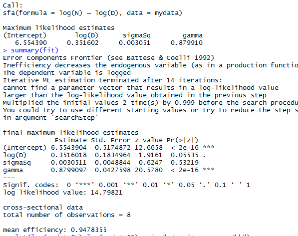 sfa(formula = log(N) ~ log(D), data = mydata)