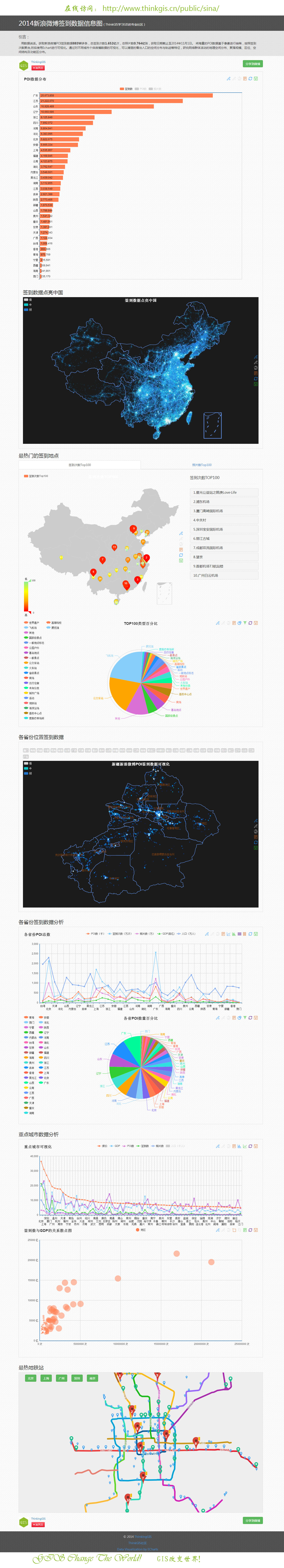 用数据说话。获取新浪微博POI签到数据883W多条,总签到次数1.652亿次,总照片数0.764亿张,获取日期截止至2014年11月1日。 将海量的POI数据基于像素进行抽稀,按照签到次数聚合,然后使用Echart进行可视化。通过对不同城市个体微博数据的可视化,可以清楚的看出人口的空间分布与轨迹等特征,研究网络群体活动的地理空间分布、聚落规模、区位、空间结构及功能区分布。 在线访问地址:http://www.thinkgis.cn/topic/5485111d452df58c0e768cbc http://www.thinkgis.cn/public/sina/