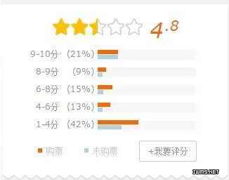 2、统计中,高分是指(8-10分)和低分是指(1-3)。购票用户中给《一步之遥》打高分的占25%~30%,打低分的占40%~45%。一首一尾,把它的分数压扁到了4.8。