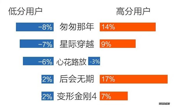 总体来说,高分用户更宽容,打的分就是比一般人高;低分用户更苛刻,打的就是比一般人低,哪怕你是《星际穿越》。
