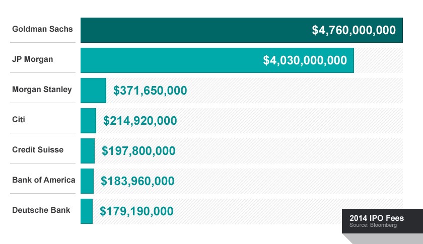 2014年,1155家公司首发上市,融资逾2380亿美元。按融资总额计算,这是2010年以来全球IPO市场表现最好的一年。高盛、摩根大通等投行的收入也水涨船高。