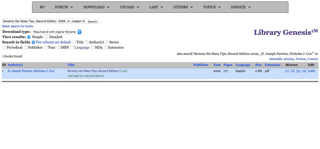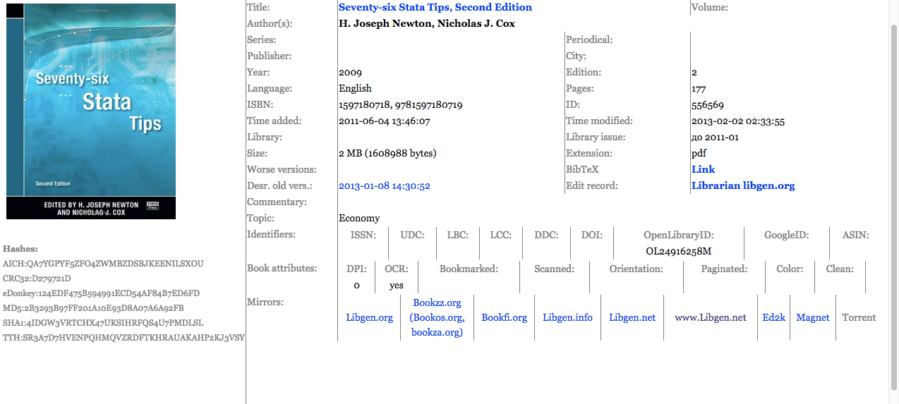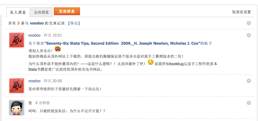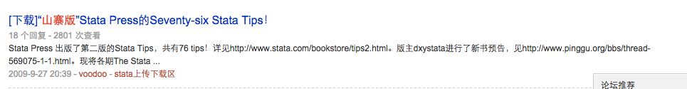 没想到人大经济论坛如此之黑啊,本人在几天前发过一篇关于“Seventy-Six Stata Tips, Second Edition 2009._H. Joseph Newton, Nichol“的帖子,上传了一本电子书收费50论坛币,结果有个voodoo的账号在我本人的帖子下留言说我从他的帖子上下载二次上传还收费云云,并申称该书是自己2010亲手整理的电子版,我的行为侵犯了他的权益。但可笑的是,该书是我从国外网站上淘下来的,截图为证: