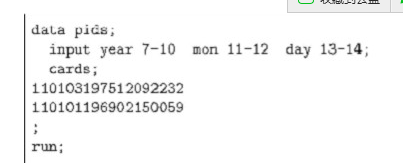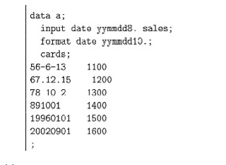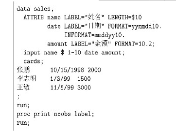 有特殊格式的数据需要用有格式输入,即在变量名后加格式名。其中最常见的是用来输入日期。数据中的日期写法经常是多种多样的,比如1998年10月9日可以写成"1998-10-9","19981009","9/10/98"等等,为读入这样的日期数据就需要为它指定特殊的日期输入格式。另外,日期数据在SAS中是按数值存储的,所以如果要显示日期值,也需要为它指定特殊的日期输出格式。例如: