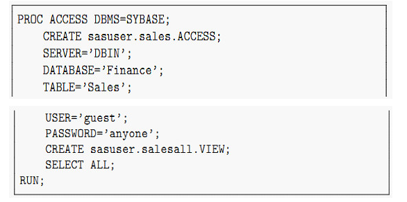 其中大写的部分是固定的。这段程序首先生成了访问描述文件SASUSER. SALES. ACCESS,然后由此访问描述文件生成了视图文件SASUSER. SALESALL.VIEW。在SAS中视图文件和数据集的使用是一样的,可以使用数据集的地方都可以使用视图文件。