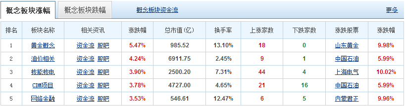 权重板块方面,昨日普跌,今日反弹。证券板块、两桶油分别成为上午和下午的护盘主力,电力、有色、钢铁、保险、房地产均翻红。以黄金为主的有色金属板块大幅上涨,其中山东黄金(600547)、中金黄金(600489)涨幅超过9%。国际环境的不确定性是黄金股表现的主要动力。