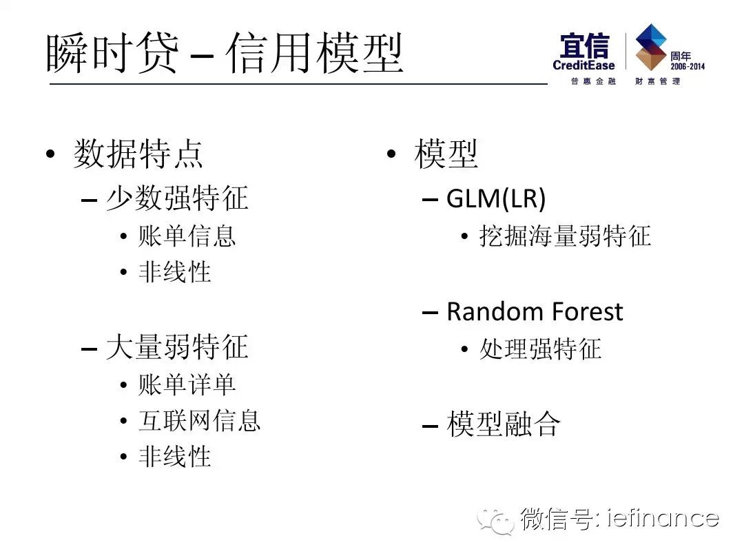 可能很多人会问我说,因为时间关系,没有办法我只能说做一个非常非常简单的展示,传统的金融机构,大家也做模型,做算法很多诸如此类的数据挖掘,传统的数据模型,比如说,他可能会放几十个变量,或者撑死了放几百个变量,我们的方法不一样,我的有几十万个或者更多的变量,传统的模型里头,非常强调说所有的这些特征,要是可以解释的。所以他需要非常非常强的特征。在我的这个模型里头,在我们这个平台的模型里头,对于我来讲,所有的数据,都是信用数据。当中交易数据,流水数据这些数据大家可以想象到,其他很多的数据,比如你的搜搜数据,网上的很多其他点击数据也是特征。如果这些特征被吸收的话,可能非常弱的特征没有关系,最后我能做出不管是信用,还是反欺诈,我后面有一堆模型在这边,我做的手段跟传统机构不一样的。