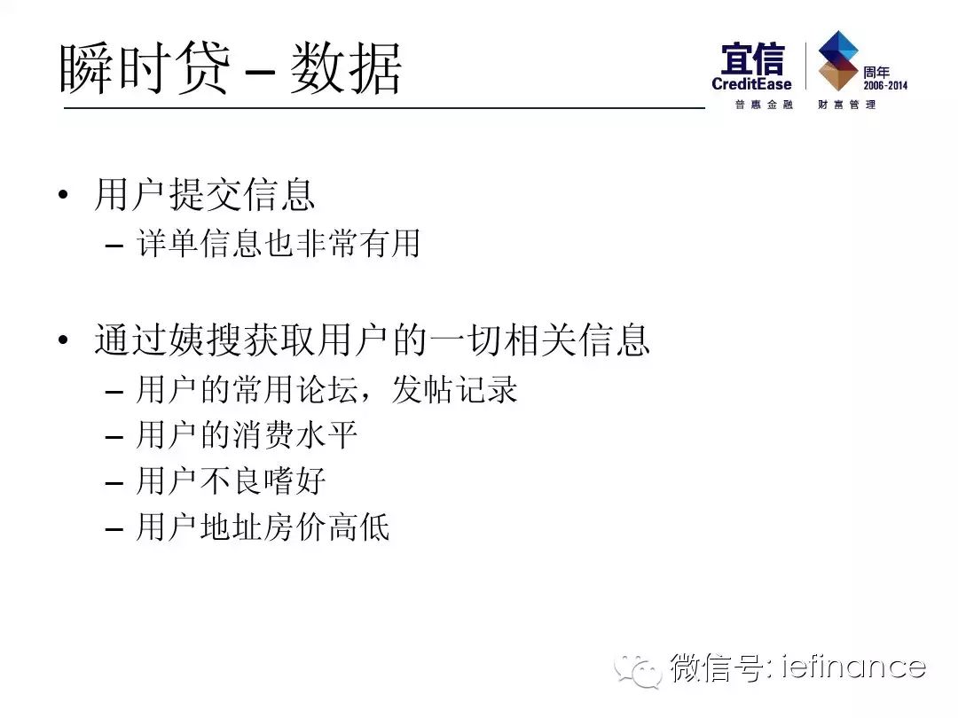 什么样的数据比如你信用卡的流失数据,比如你在淘宝,天猫京东的购买数据,或者你在运营商的通话记录,加上其他我们已经爬下来的,我们做了搜索引擎,大量的网上的数据,加上宜信自己的数据,还有我们很多生态伙伴第三方的数据。所有的数据加起来,我能够做出来,在实时一分钟其实是几毫秒之内,能够做到给你授信,你给我这些数据,我能说不能贷给你,还是能贷给你两三万,我眼看着向10亿在迈进,我们这是我们做的第一个产品。