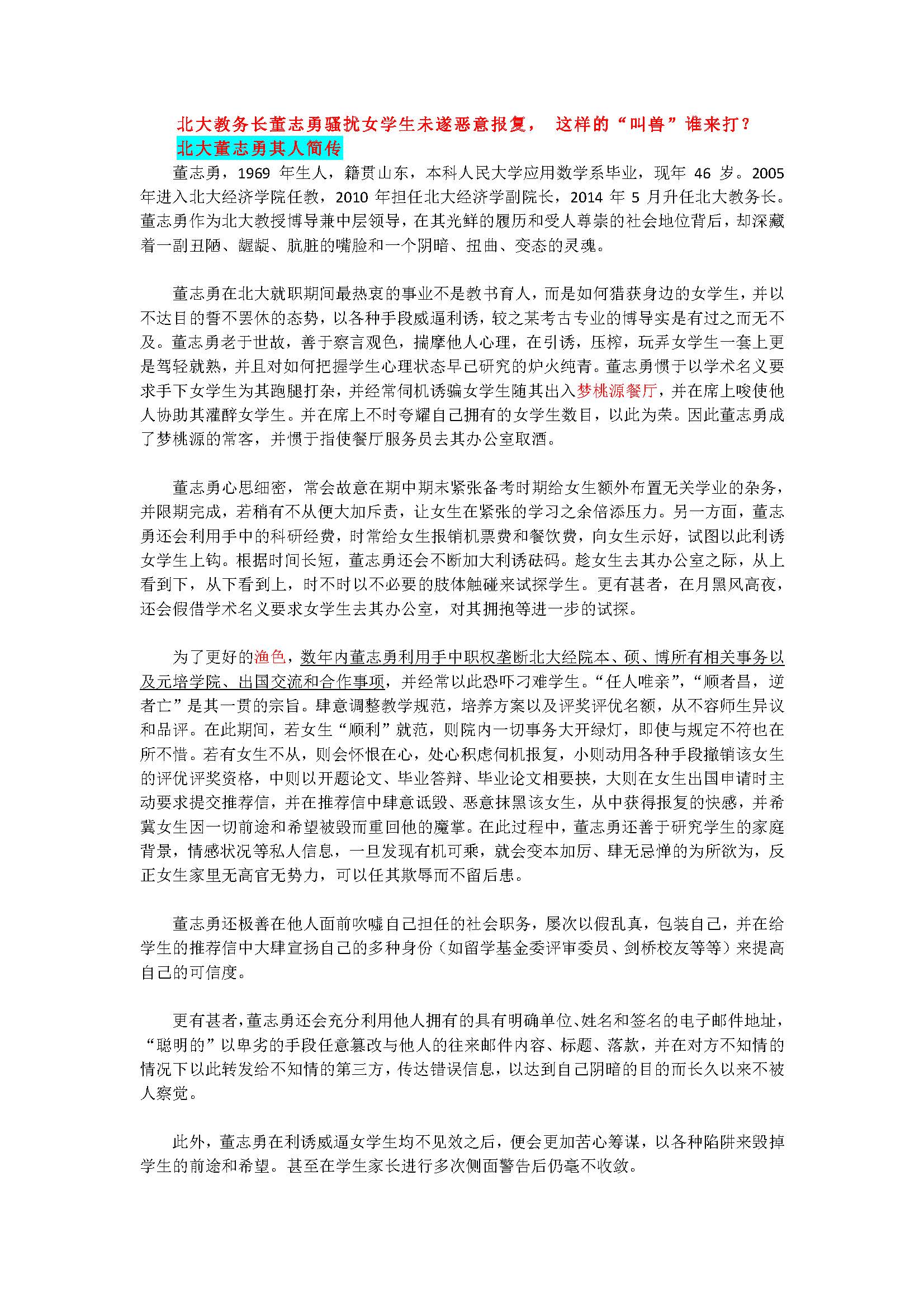 5. 在当下的中国社会下,所有的学生尤其是经济学生都面临着极其激烈的升学、出国、就业竞争,在校面临评奖评优、保研保博、出国申请的压力,毕业后面临找份好工作的压力,这对任何一个上进、有追求的学经济的女生就成为了致命死穴。淫兽教师就盯准了女生的这些弱点,屡次以评奖评优、毕业论文、毕业工作、保研保博为名,或利诱或威逼。被利诱威逼成功者大有人在,继而淫兽教师愈发得意,自诩为:大家都是成年人,你情我愿各取所需。甚至认为出身草根的女学生根本就没有反抗的资格,只有认命的权利。若“运气不好”遇上正直不受利诱威逼的学生而未能得逞者,则会永远恼羞成怒、怀恨在心,但在外人面前表面会装作格外的大度宽容能与学生友好共处,甚至会大肆表扬其学生以迷惑众人和学生本人以求趁机暗地里给予其打击报复而使不知内情的师生懵然不觉。比如在开题报告和毕业答辩前对学生的论文写作要求和邮件不理不睬,但在答辩场上伺机为难学生,甚至想办法提出重写重开题的建议并引诱其他老师赞同,以名额不够为由取消优秀毕业生的资格甚至在出国申请的推荐信上大肆诋毁学生的正直和人品,给予学生以沉重打击。