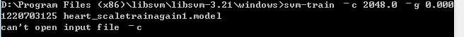 svm-train –c 2048.0 –g 0.0001220703125 heart_scaletrainagain1.model