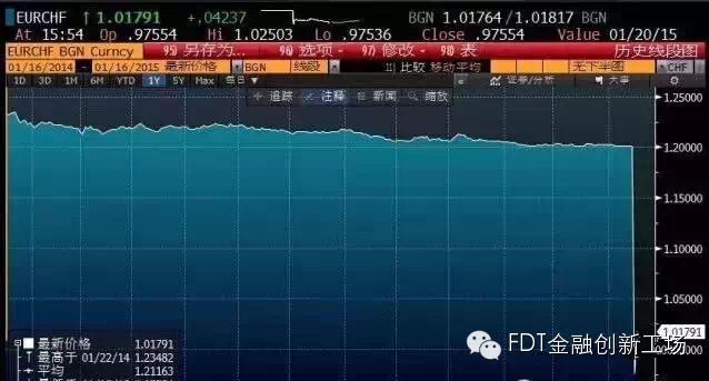 瑞士央行杀了全球市场一个措手不及,消息公布后的几分钟内,欧元兑瑞郎汇率最大跌幅超过40%,从1.2直线暴跌至0.85,随后又回到1附近,这是外汇市场数十年来罕见的大幅波动。