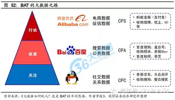 用户的行为分为三大类,关注,产生欲望以及付诸行动。以BAT 为例,阿里手握电商数据,征信数据,数据真实性最好,最靠近销售交易环节,类似CPS 的盈利模式,因此也更加重视在非销售金融领域的布局,例如收购微博、优酷、UC 等,形成更大的商业闭环;百度具有搜索数据与公共数据,类似CPA 的盈利模式,但其真实性不如阿里,社交性不如腾讯,因此推出微购、收购糯米、参股Uber 以强化金融/电商数据,再通过贴吧、爱奇艺等丰实社交数据;腾讯的社交数据、关系数据出类拔萃,盈利模式较像CPC,但CPC的变现天然有短板,于是它不遗余力地推进电商数据的获取能力,e.g.参股京东、大众点评,同时在搜索上收购搜狗。因此三家都在以自己的数据为基础,通过参股、并购等方式勾勒更加完整的数据地图。