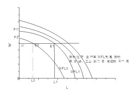 图中斜线内为总财富,其中WELiO归工人所有,用于消费,PEW为利润,取决于劳动生产率。MPL表示劳动的边际生产率。W是工业部门的工资水平。随着劳动力从农业转向农业,