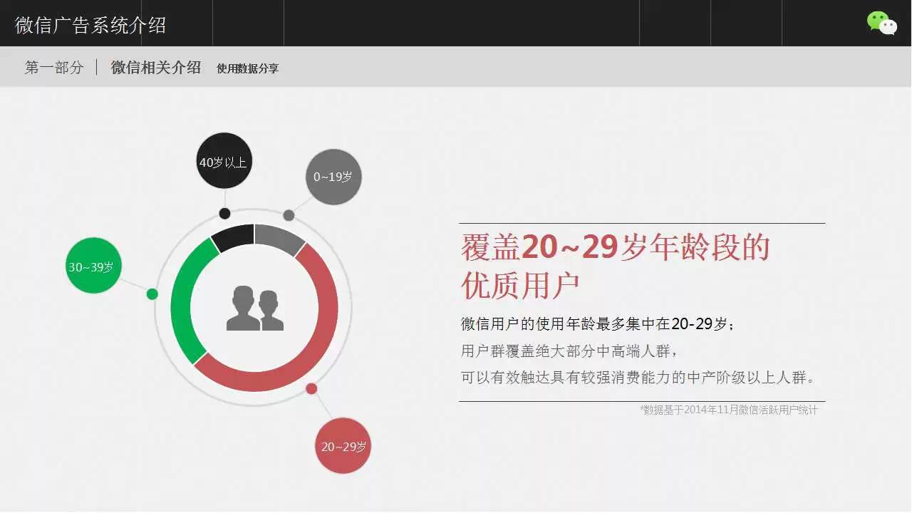 按售卖策略显示,如果按全国不定向区域投放的话,是40CPM,若以2亿左右的展示量,单次投放费用在800万以上,如果加上链接的话会再增加20%,所以网络上传播的1000万以上的合作费用是比较靠谱的。 广告价针对北京、上海这样的核心城市有更高的标准,达到了140CPM,其他一二线城市的价格也在90CPM。北京上海的童鞋,感受到自己的身价蹭蹭往上涨了咩? 好啦,综上所述: (1)金矿:微信目前有4亿多活跃用户, 每天朋友圈信息量30亿,含金量巨大; (2)Feed:朋友圈广告形式为Feed广告,与其他朋友消息极其类似; (3)智能:广告是基于好友的行为智能推送的,反感度不会太强烈; (4)克制:如果无互动,广告6小时后自动失效,48小时内只会出现一次广告; (5)千万:全国投放一次的价格在千万级别,今后投放最少也要500万以上。 1、下述PPT为腾讯微信广告系统介绍,其中包含四部分,分别为:微信相关介绍、微信广告—公众号部分介绍、微信广告—朋友圈部分介绍、微信广告精选案例。 2、该PPT来源于网络,仅为传递信息之目的,大家可以网络搜索相关内容,但是不代表本博主的观点。 3、本人非腾讯内部人士,仅是一个对微信很感兴趣的人,特此说明。 4、此PPT值得互联网从业人员研究,看完后您又有什么感受呢?!