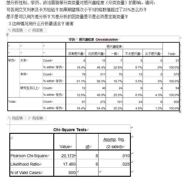 xddlovejiao1314 发表于 2015-2-3 16:21 所有的所有都是看的“卡方检验”这个表,期望全大于5看第一行的Pearson对应的sig值,不满足脚注会提示(如 ...