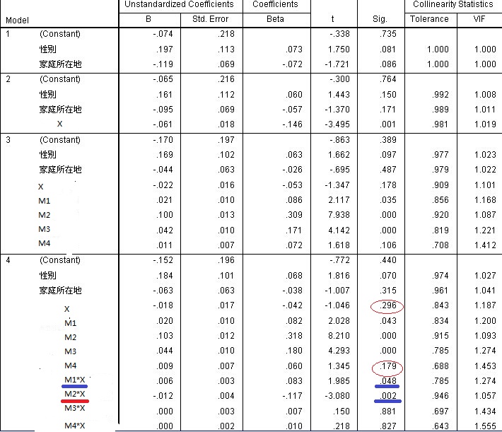 X是自变量 M是调节变量(包含四个维度,分别是M1、M2、M3、M4),性别和家庭所在地是控制变量。我是想做调节变量M所以维度对X与Y关系的调节效应。我现在有如下问题,希望有好心人能帮忙解答一下:(1)我把调节变量所有维度及所有维度与自变量的乘积项一起做回归的,不知道这样对不对?
