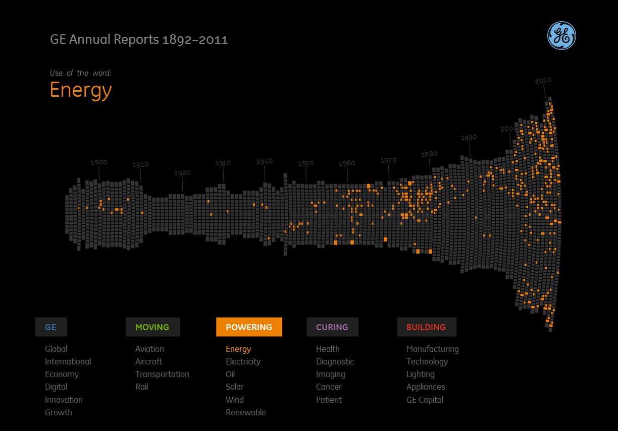 通用电气这样诠释这份年报可视化报告:我们通过扫描6000页的年度报告,建立起这份交互式年报可视化程序。其展现的不仅是通用电气的成长历程,更是美国乃至整个世界从1892到2011的发展进程。一个世纪以来的关键技术、创新故事,等待着读者自己去发现!