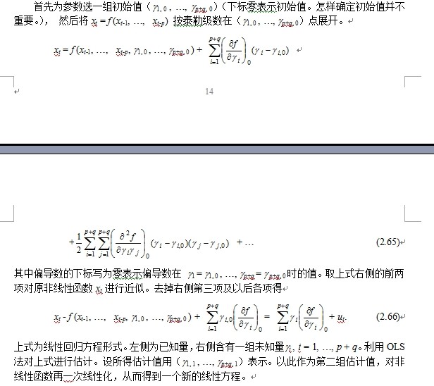 同求,我最近也在做这个,我AR(P)模型可以计算拟合,各项参数和Eviews结果一模一样,ADF检验我也写了算法也是对的, 可是就是MA(q)和ARMA不行,MA我用的矩估计明显不行,只有当这个序列确实是MA模型而且阶数必须等于MA模型的阶数,用矩估计才能迭代收敛,而且精度还很差。。。郁闷中。。。。求MA(q)模型的非线性最小二乘法的算法,公式也行,就是用泰勒级数展开后的最终结果,是最终,要最后一步确切的结果,是要不含有有f(x,a)和偏导数推导,需要具体公式,就是附件图片中(2.66)式的展开结果