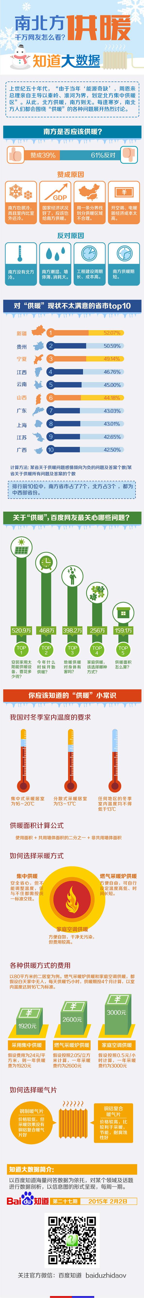 又逢一岁寒冬时,到底有多少网友支持南方供暖呢?最近,百度知道针对“供暖“问题,出了一期“知道大数据”。知道大数据是以百度知道上的海量数据为依托,围绕某个主题,进行数据挖掘,同时也有相应的知识点引申,每两周出一期。据悉,百度知道是全球最大的中文问答社区,每天响应3.8亿次的问题搜索需求,用户数近亿。是国内为数不多的可以称为“大数据平台”的载体。