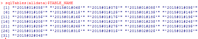 mydata<-lapply(sqlTables(alldata)$TABLE_NAME,function(x) sqlFetch(alldata,x))写入数据
