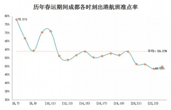 我们可以看到以小时为单位,历年春运期间成都各时刻出港航班准点率情况。最准点的出港航班时刻为6点—7点,准点率达到78.01%;最不准点为22点—23点,准点率仅为48.58%。