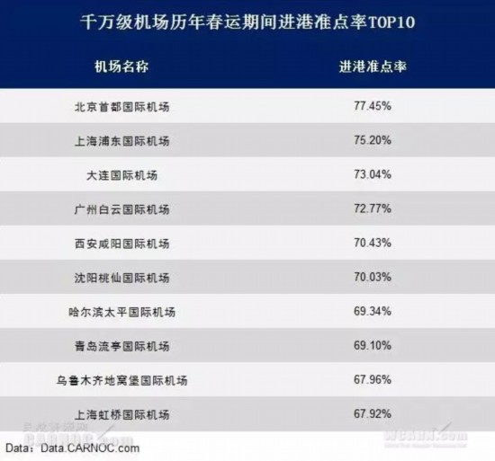 如图所示,千万级机场历年春运期间进港准点率一目了然,北京首都国际机场进港航班准点率排名第一,为77.45%,上海浦东国际机场以75.20%的进港准点率排名第二,大连国际机场以73.04%进港准点率排名第三。
