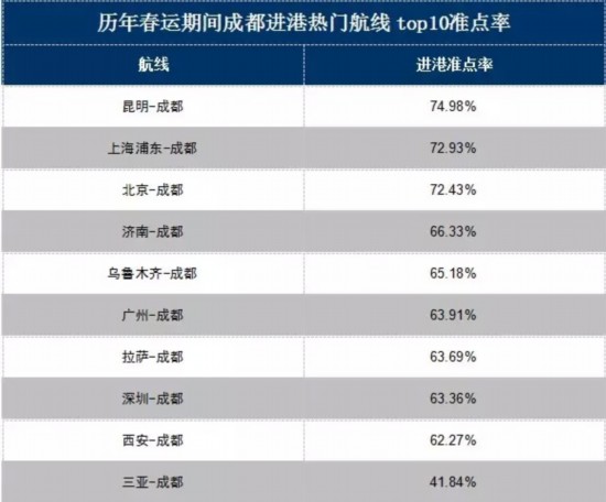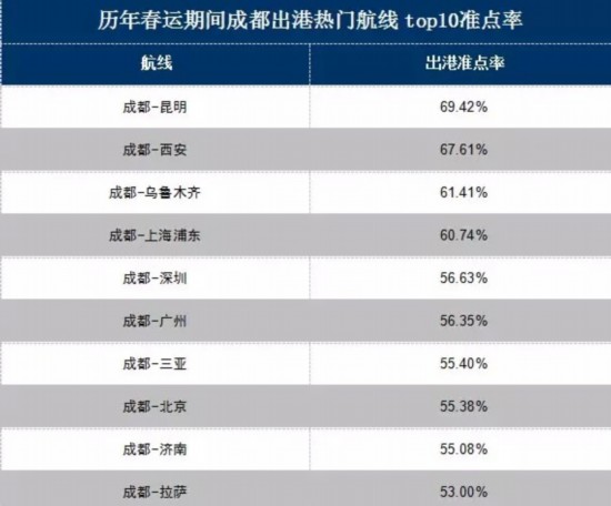 如图所示,成都出港热门航线准点率最高的是成都—昆明,达到近70%。