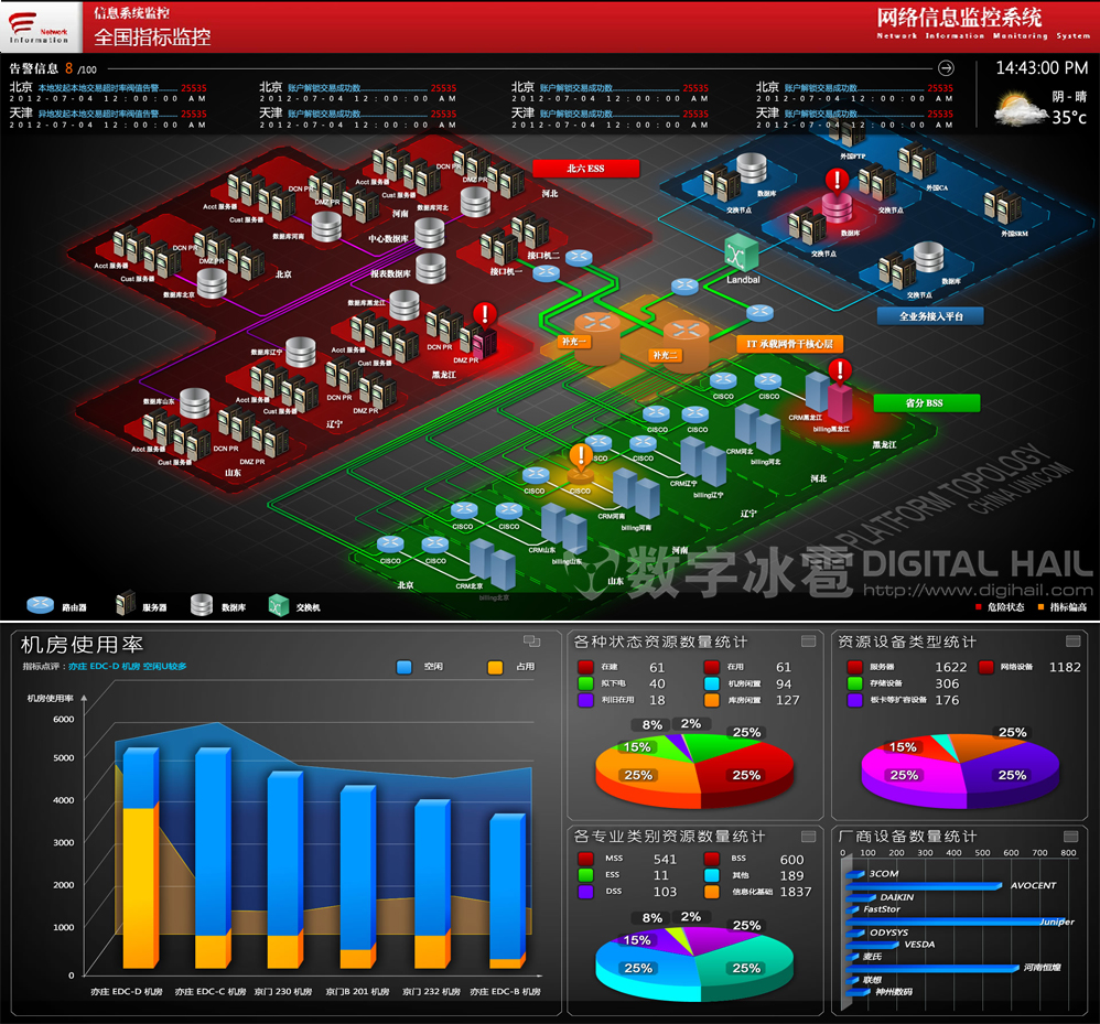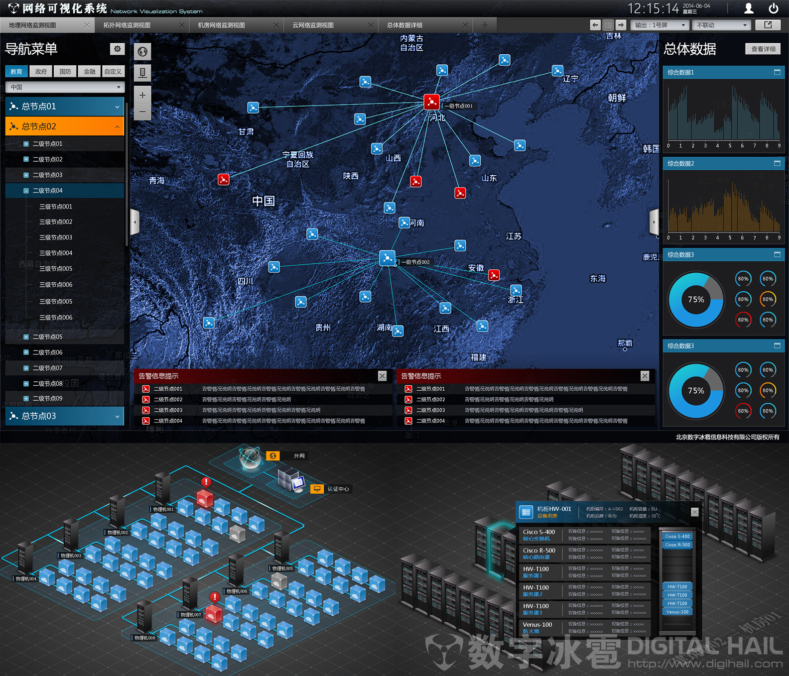 专注于数据可视化领域的数字冰雹公司CEO邓潇表示,IT 网络管理可视化系统支持从大范围的主干网络、城市各级数据中心、到具体的单台服务器的网络流量、资源、安全态势、设备状态等数据进行全面监控。对于云架构的IT网络,也可以提供清晰、全面、易于理解的数据监控。