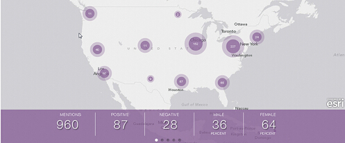 通过与IBM阿尔马登研究中心的加速发现实验室合作,Esri创建了一种称为舆情监控的交互式概念验证(proof-of-concept)地图,使用Tweets和地理空间技术来了解客户情感并聚焦于品牌管理。IBM阿尔马登研究中心的加速发现实验室是进行跨行业大数据分析的最先进的实验室。
