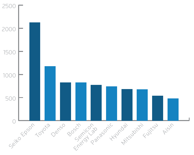 导航相关专利由日系占据多数席位,精工爱普生居首位,其后有丰田和电装紧跟;半导体能源实验室(公司),松下,三菱,富士,爱信……像是挂满鲤鱼旗的日料店。