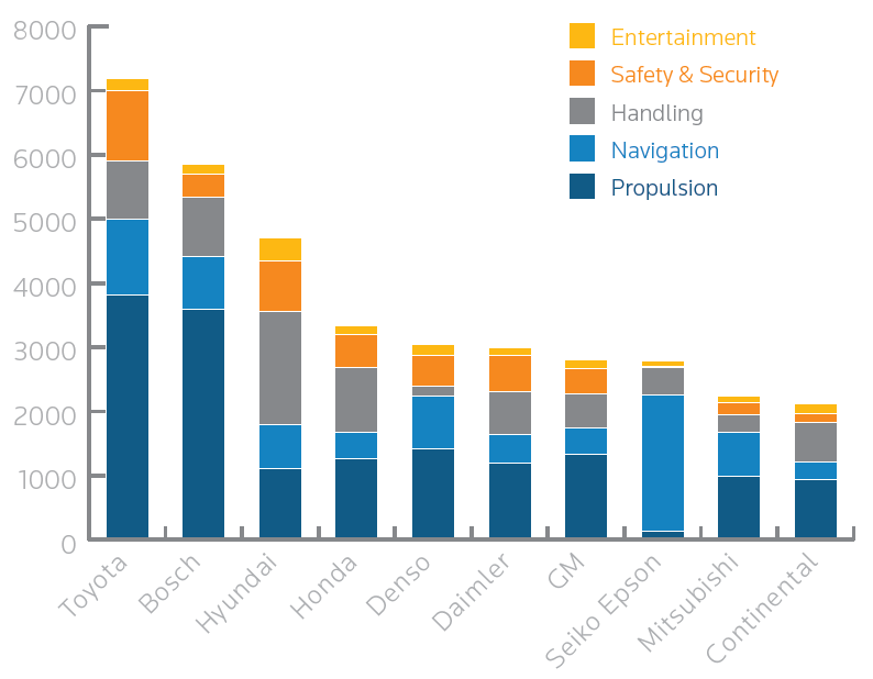 汤森路透在1月份发布了一份研究报告,统计了2009-2013五年间行业内的专利获取情况。时至今日,革新的突破点已经主要集中在新能源、导航和安全系统之上。在进入报告之前,需要提醒诸位注意的是,这只是从专利角度得出的分析,其排名并不是指当前技术地位排名。