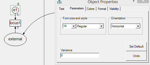 你好。其实完整的表述是“将单一指标的测量误差项的方差固定为0”。如图所示,是将“external”的测量误差项“e1”的方差固定为0。具体操作就是右键“e1”,然后选择object properties, 点parameters, 在variance下面输入0就完成设置了。这是Amos的操作方法,lisrel怎么操作我不是太清楚。不过原理应该差不多,就是将单一指标的测量误差项的方差固定为0.