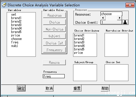 点击OK后进入变量界面,将要选择布置如下变量:一个因变量(response)、若干选择属性变量(choice)、一个测试变量(subject variable)。也可以选择一个频率变量(frequency)和若干非选择属性变量(non-choice variable),如果选择了频率变量,测试变量可以不必。