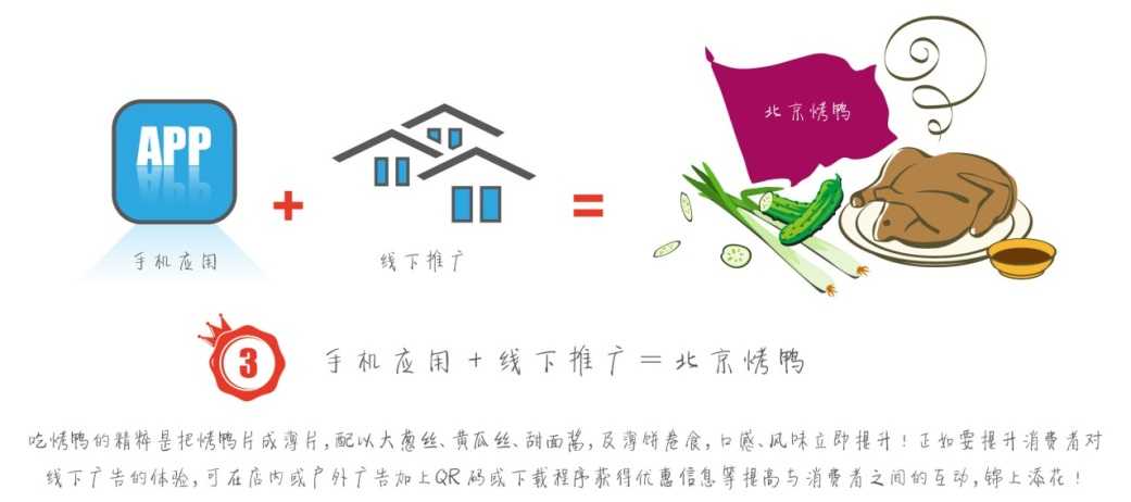 吃烤鸭的精粹是把烤鸭片成薄片,配以大葱丝、黄瓜丝、甜面酱,及薄饼卷食,口感、风味立即提升!正如要提升消费者对线下广告的体验,可在店内或户外广告加上QR 码或下载程序获得优惠信息等提高与消费者之间的互动,锦上添花!