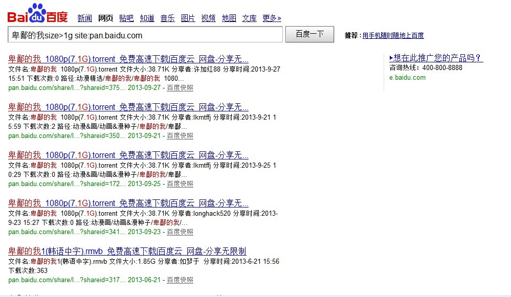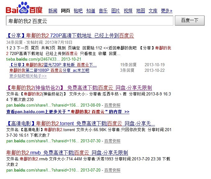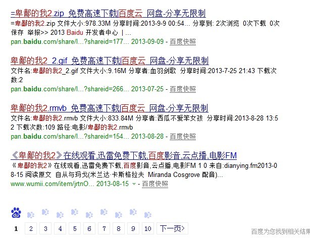 时候如果你没有找到自己看中的资源,这时候你可以在搜的资源名称后面加上想要设置的搜索条件,虽然我不知道那些高级命令是什么,但是可以大体属于,比如我自己常用的就是,下电影,因为越大的越清楚,我会输入size>1g,就是要电影的大小大于多少,或者download>1000,设置搜索或者下载的次数大于1000,但是如果这时候搜出来的资源比较靠后,下载速度会比较慢。下面举个例子,如我要搜索刚出的卑鄙的我2,首先在百度上输入如图下面两张图片,【注意】下载时不要一次同时下载太多的任务,这样会导致下载速度很慢!