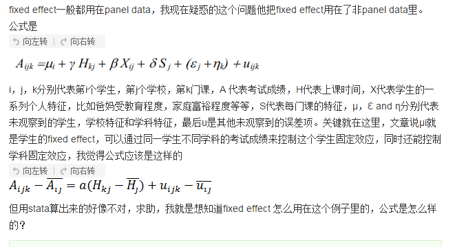 但用stata算出来的好像不对,求助,我就是想知道fixed effect 怎么用在这个例子里的,公式是怎么样的?