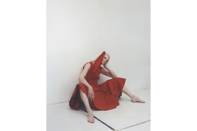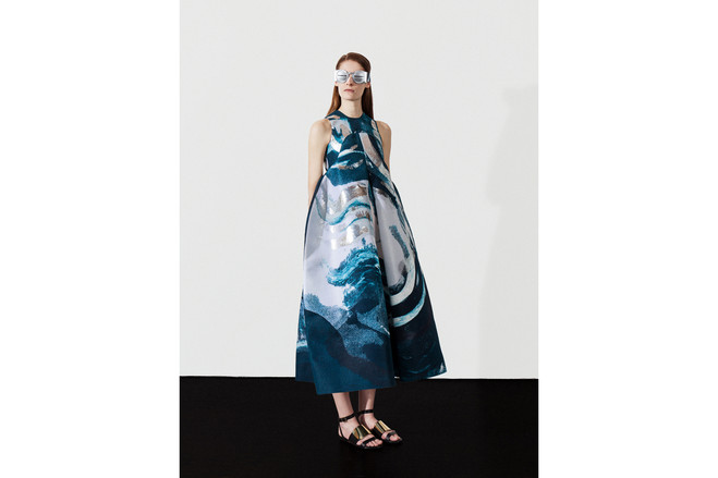 时尚类:候塞因·卡拉扬(Hussein Chalayan)设计的一款带鳍状领绉褶裙。